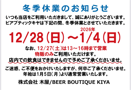 冬季休業のお知らせ 2025/12/20 お知らせ いつも当店をご利用いただきまして、誠にありがとうございます。 弊社冬季休業は【12/28(日)~1/4(日)】となります。 年内最終営業日は12/27(土)13~16時まで物販のみとなりますので、お気を付けください。 お買い物も店内飲食もできるのは12/26(金)まで、 最終のお買い物ができるのは12/28(土)16時までとなります。 年内最後までどうぞよろしくお願いいたします。 ツイート 前の記事お知らせ一覧次の記事